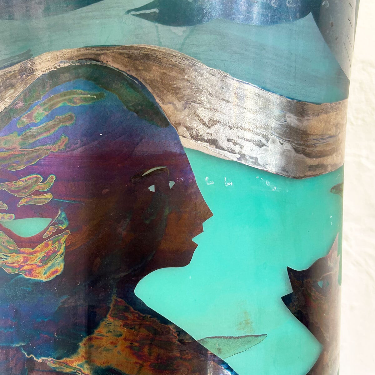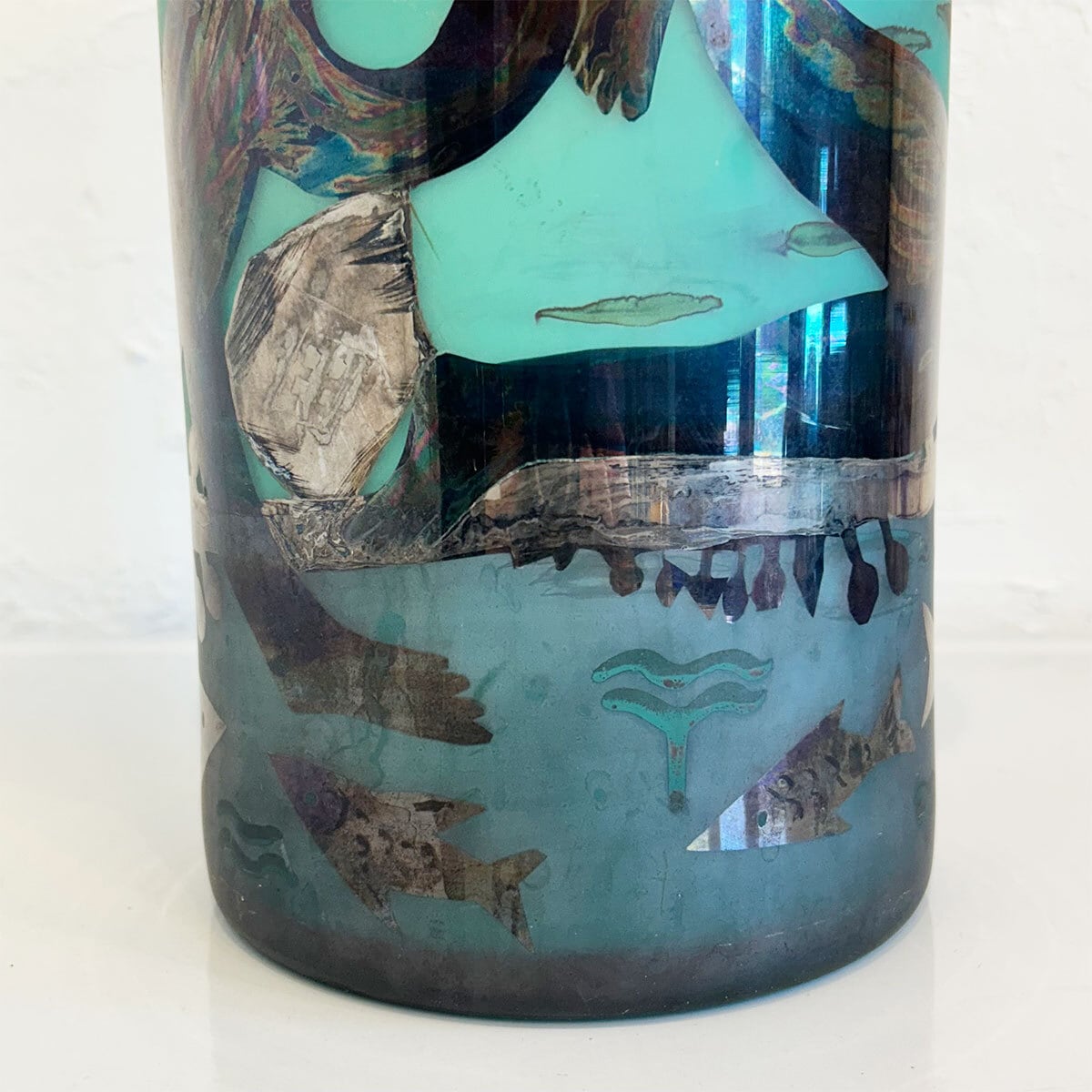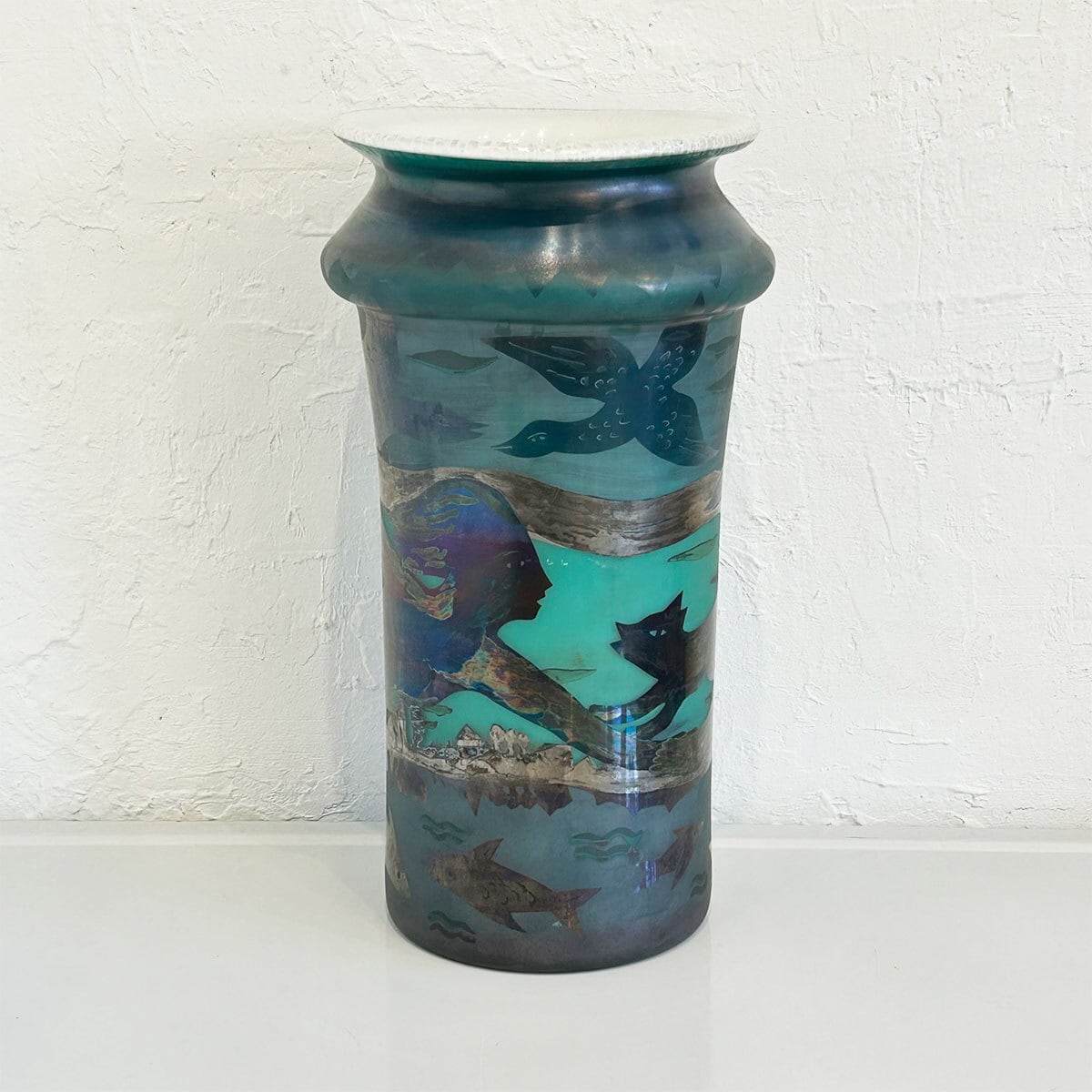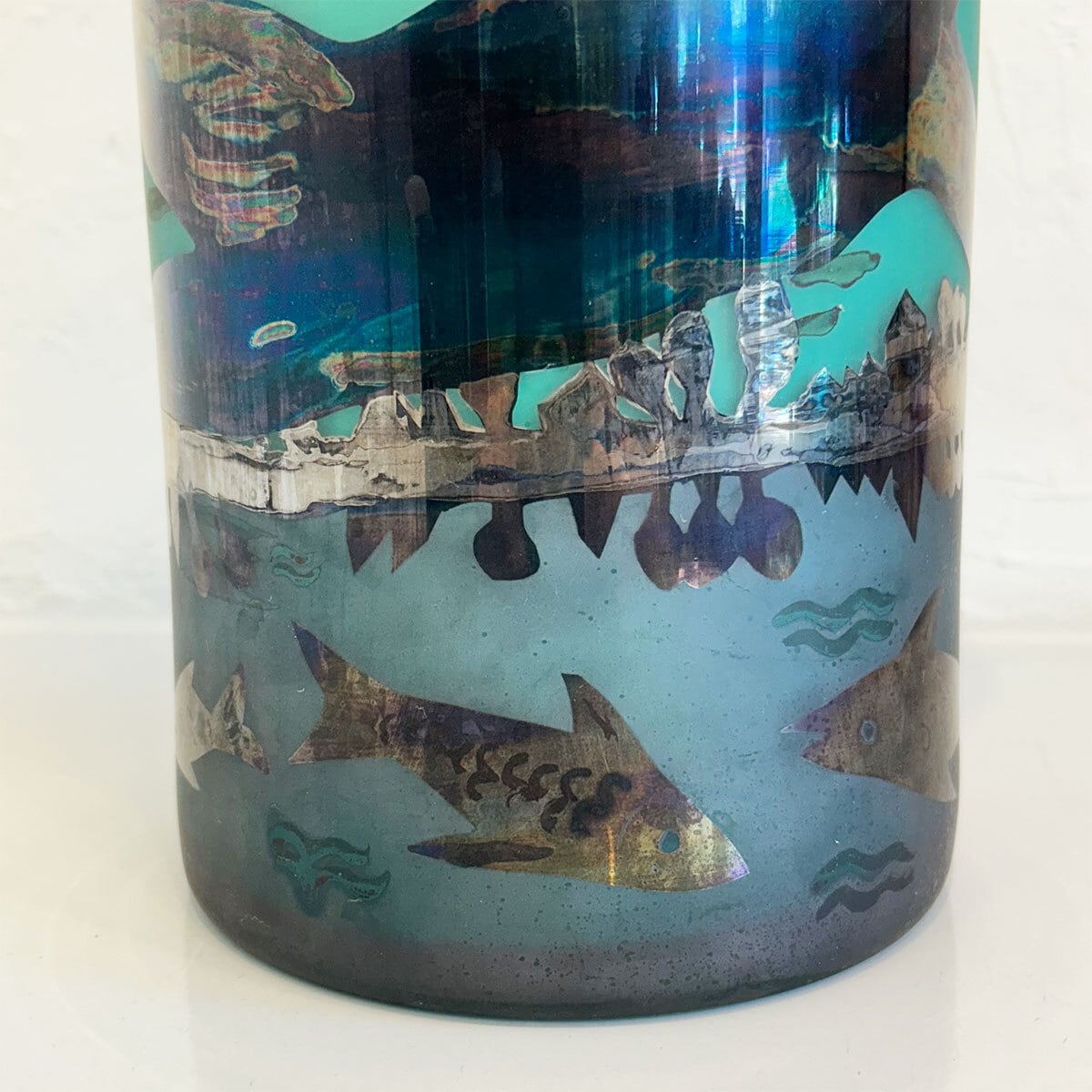 表面に描かれた魚、海鳥、そして人物のシルエットなどは