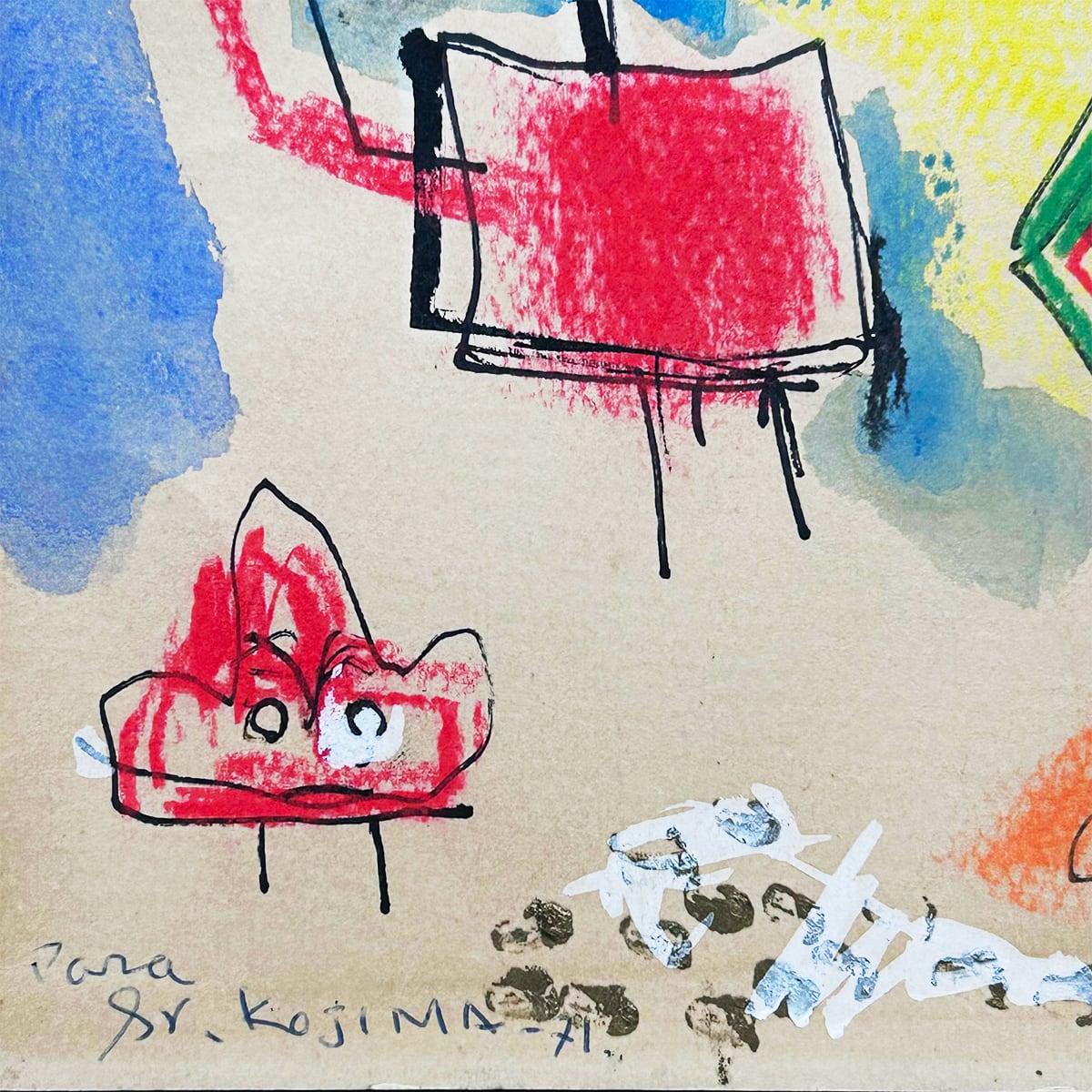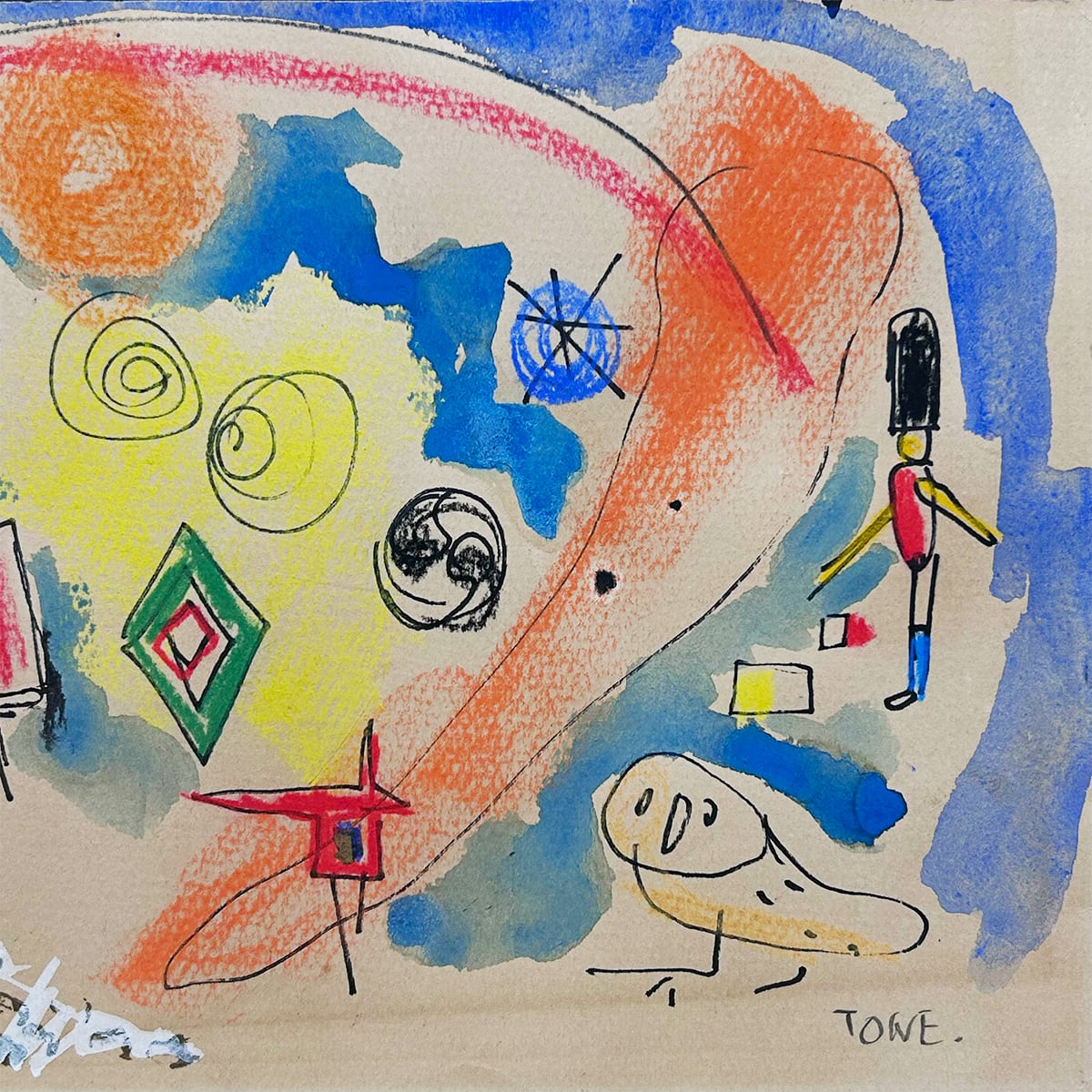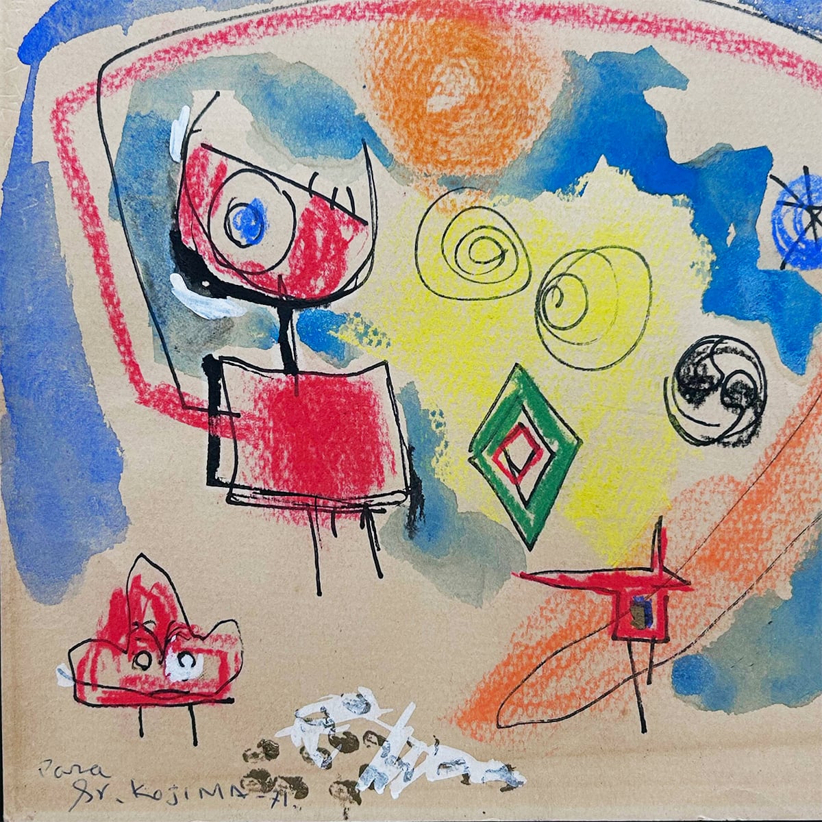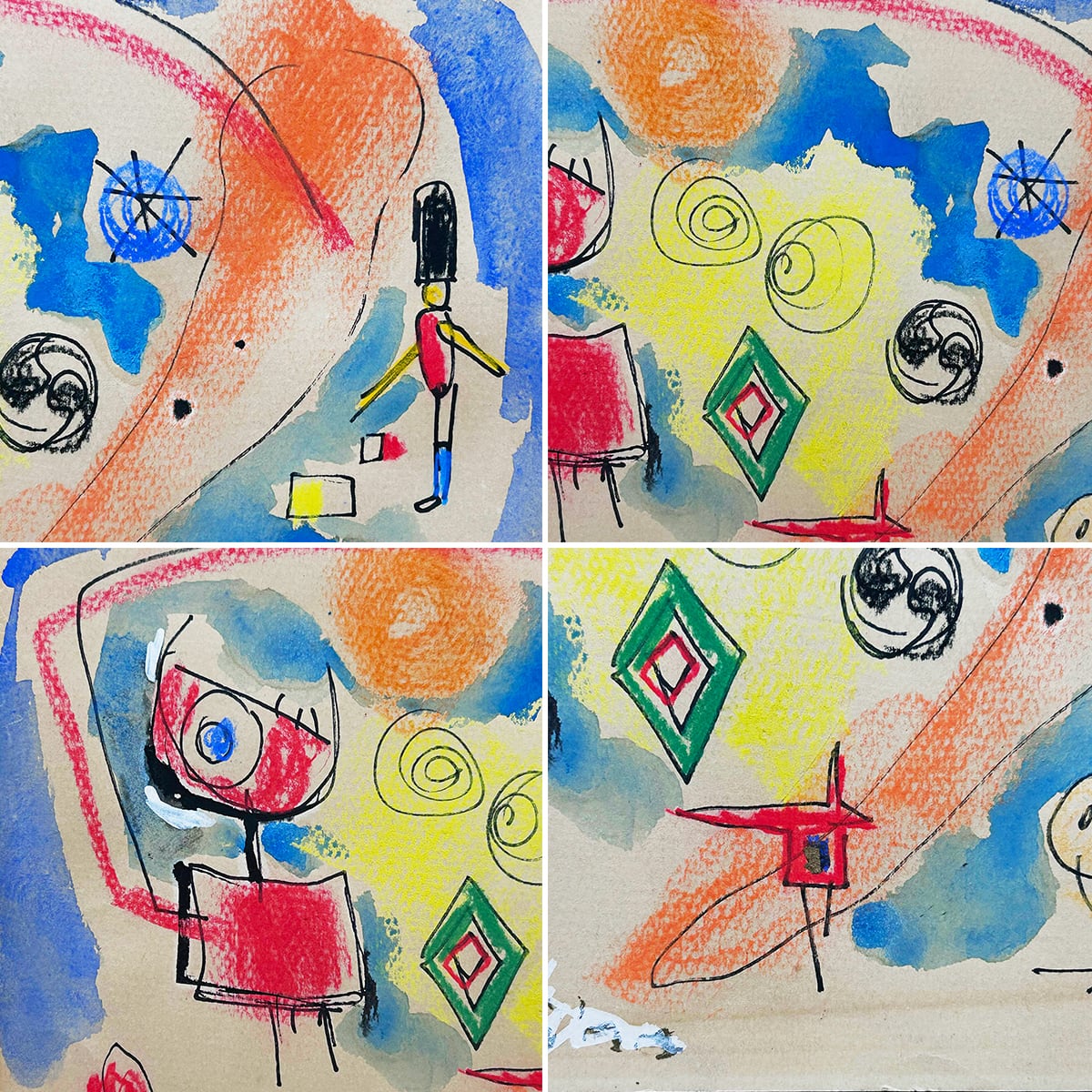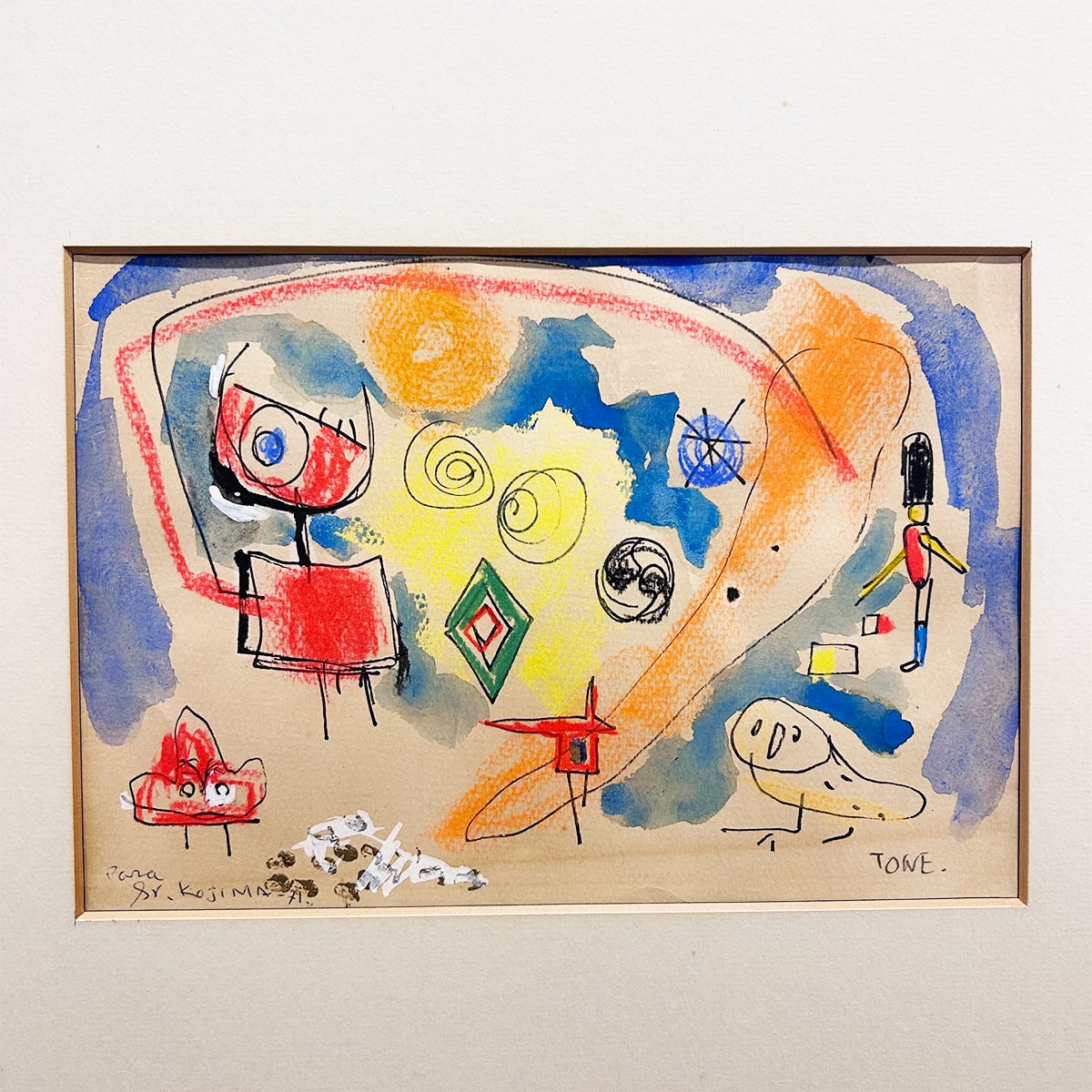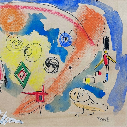 淡くにじむ水彩の色彩の上に自由でユーモラスな線描が重なり
