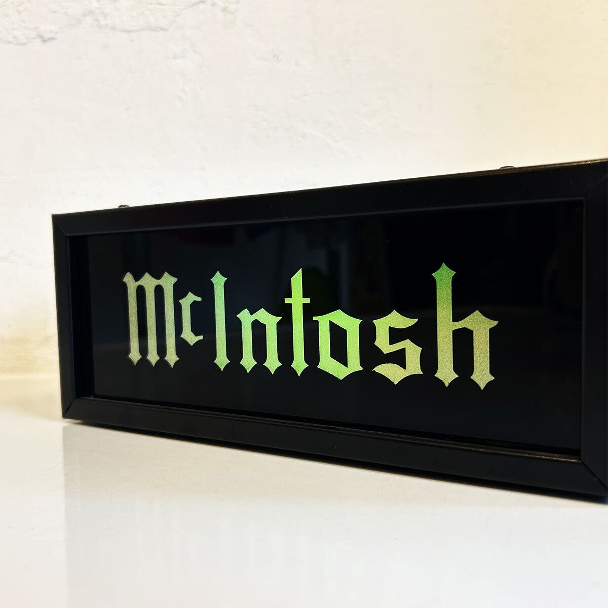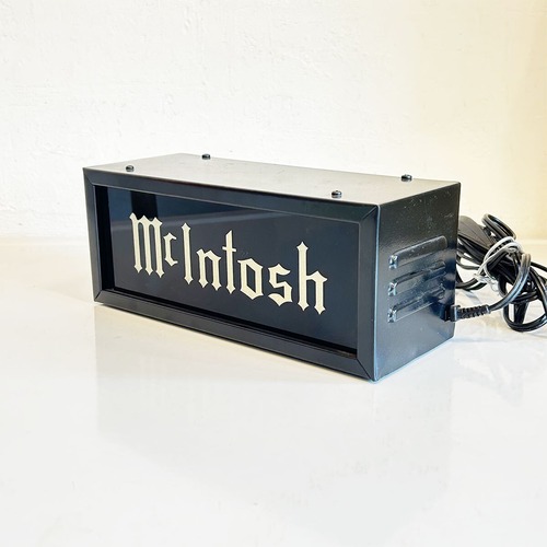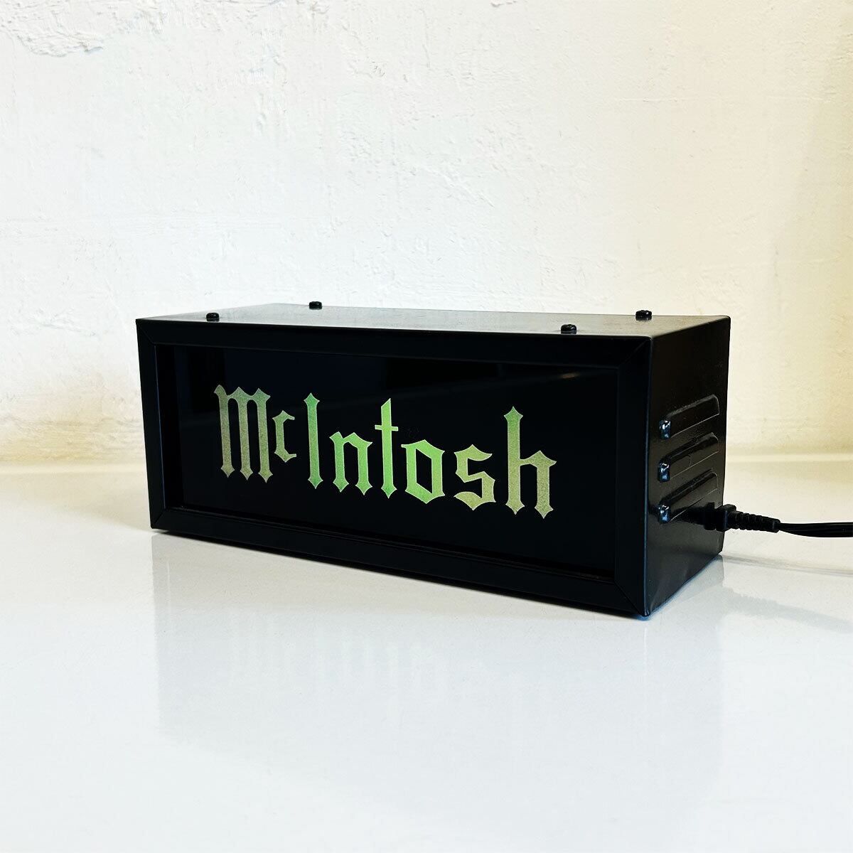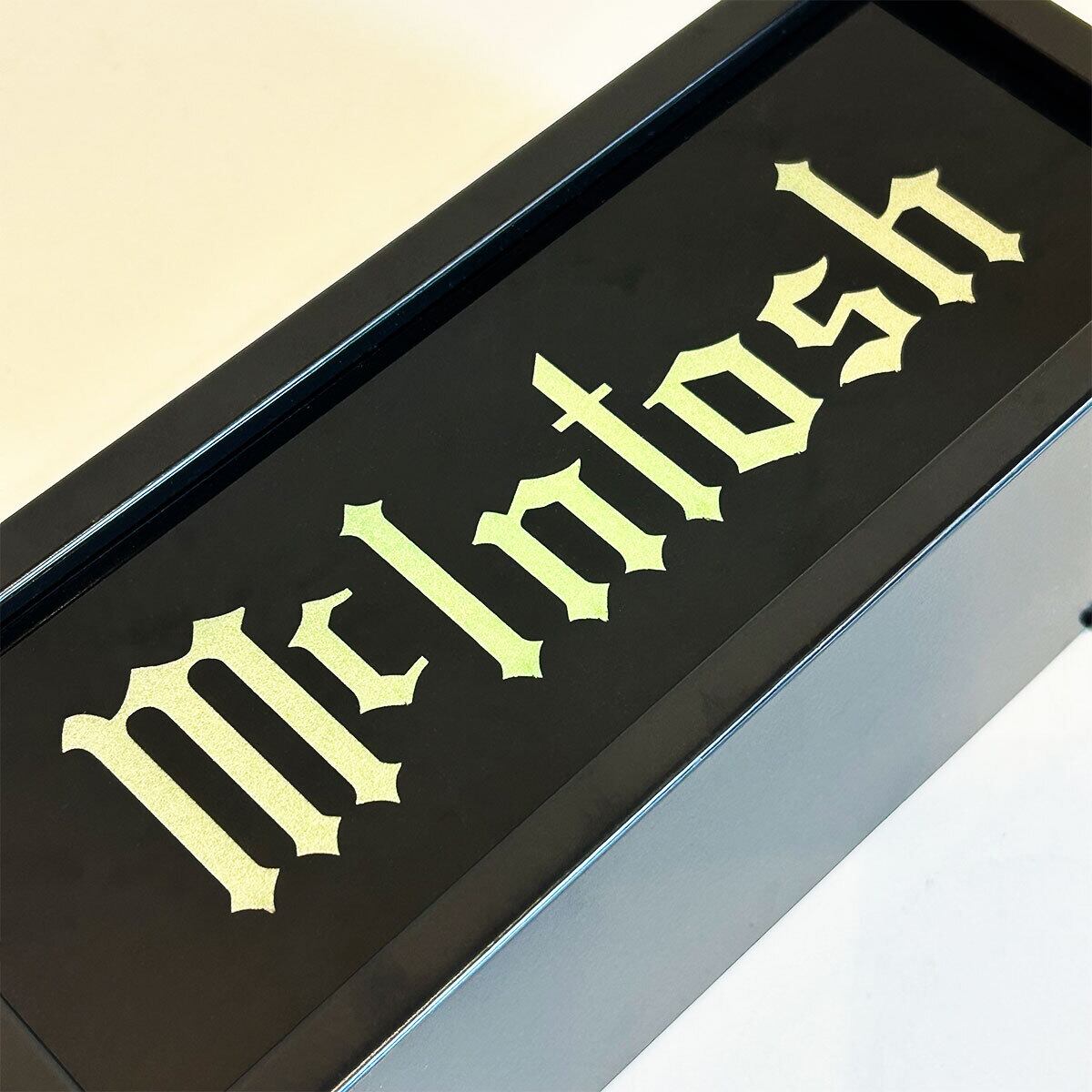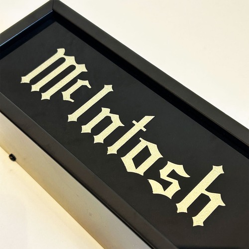 ブラックのボックスフレームに、ゴシック体の“McIntosh”ロゴが浮かび上がる印象的なデザイン。