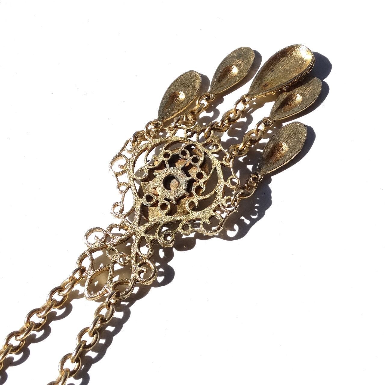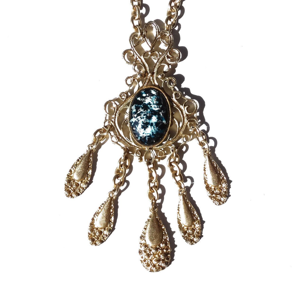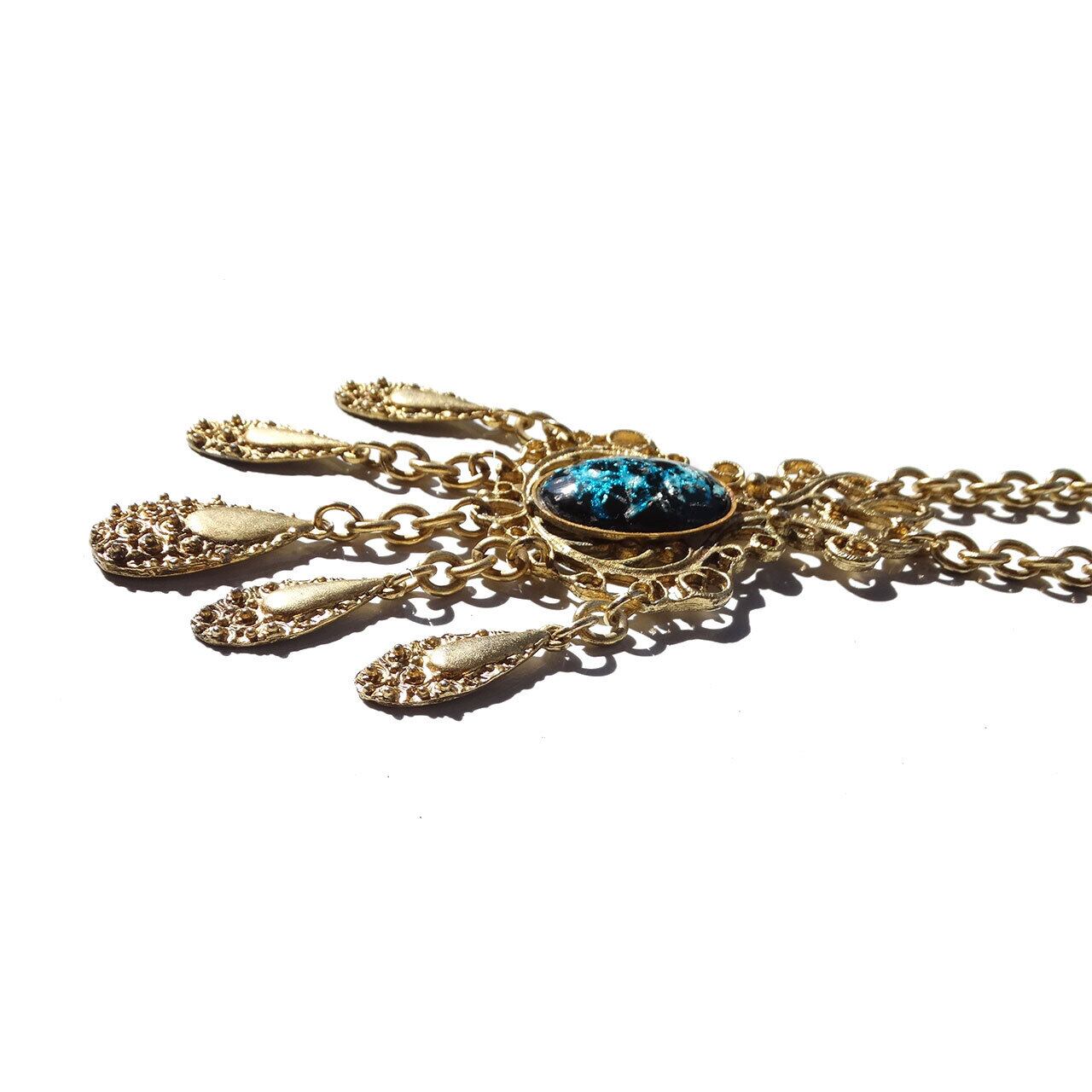 70s Vintage gold tone gothic design blue cloisonne ware necklace