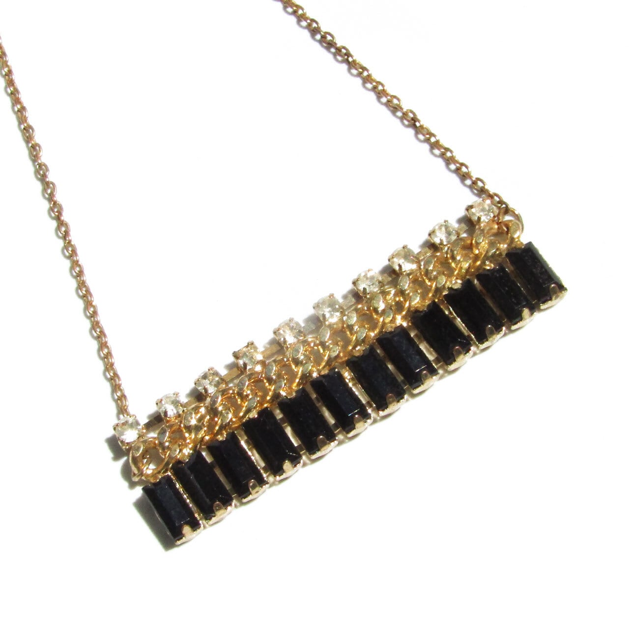 スクエアのブラックビジュとチェーン上のゴールド、トップにはラインストンが並べられたモードな雰囲気に仕上げになっております。